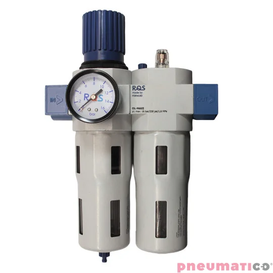 Dwuczęściowy zestaw służy do oczyszczenia sprężonego powietrza zanieczyszczeń stałych i płynnych o odpowiednich wielkościach zgodnie z zastosowaną wkładką filtracyjną oraz do nastawiania i utrzymywania stałej wartości ciśnienia wyjściowego w instalacjach pneumatycznych niezależnie od zmiany ciśnienia wejściowego powyżej ciśnienia zredukowanego. Zamontowany dozownik oleju służy do nasycenia olejem powietrza zasilającego odbiorniki wymagające smarowania. Ilość dozowanego oleju wynosi od 1 do 12 kropli na każde 1000L przepływającego powietrza.