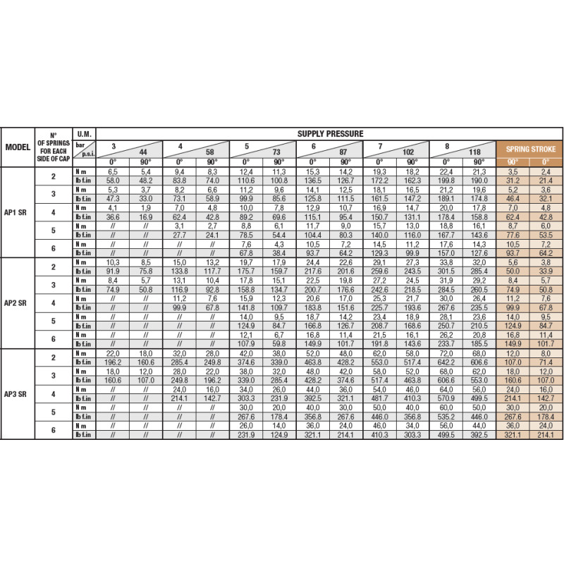 - moment obrotowy dla ciśnienia zasilającego 6 bar: patrz tabela w załączniku