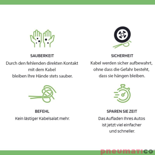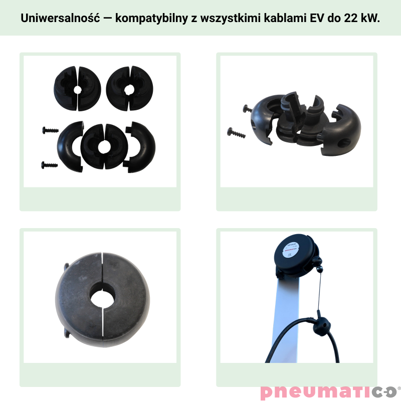 Uchwyt EVP marki Pneumatico to innowacyjny uchwyt z funkcją automatycznego podtrzymywania kabla, który rewolucjonizuje proces ładowania pojazdów elektrycznych. Używając tego uchwytu zapomnisz o splątanych i brudnych kablach ładowarki. Najprostsze rozwiązanie dla wszystkich kabli EV do 22 KW. Można zamontować na ścianie lub suficie i przymocować do kabla EV i... to wszystko! Działa ze wszystkimi markami wallboxów i z każdym rodzajem kabla, zarówno w nowej, jak i istniejącej instalacji! Nadaje się do użytku na zewnątrz i w trudnych warunkach pogodowych. Wyposażony w wytrzymałą, tekstylną linkę z włókna polietylenowego HT. Uchwyt ma dwa tryby pracy: ciągły i zapadkowy