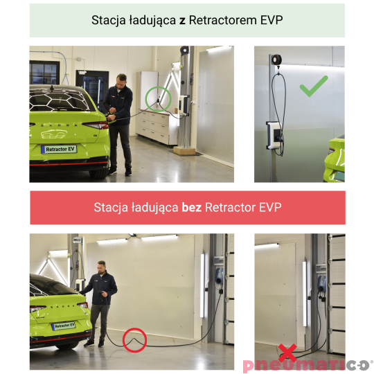 Retractor EV służy do zarządzania kablem ładowarki samochodu elektrycznego. Obudowa Retractora wykonana jest z plastiku, co zapewnia odporność na niesprzyjające warunki atmosferyczne. Nowoczesny design zapewnia wysoką estetykę produktu. Linka Retractora ma aż 300 cm długości. Montaż Retractora jest prosty i szybki. Podwieszony kabel pozostaje zawsze czysty, tak jak dłonie osoby obsługującej.