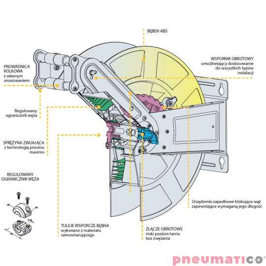 - Przemysł spożywczy: Zwijadła są niezastąpione w zakładach przetwórstwa spożywczego i produkcji żywności, gdzie wymagane są higiena i bezpieczeństwo. Umożliwiają łatwe przechowywanie węży do mycia sprzętu i powierzchni produkcyjnych, co minimalizuje ryzyko kontaminacji oraz usprawnia organizację przestrzeni roboczej.